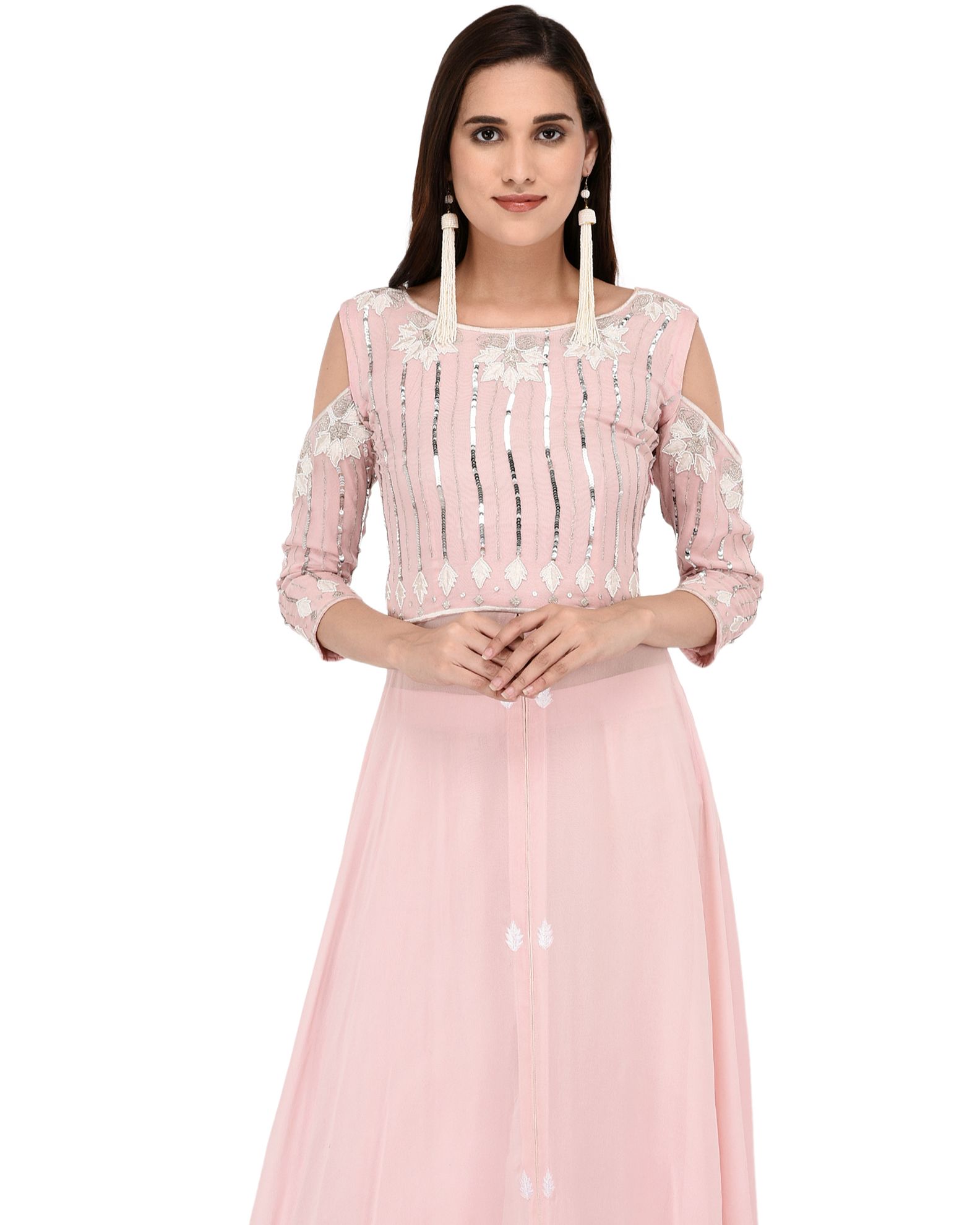 This elegant light pink cold shoulder kurta in georgette base has machine embroidery and sequins work all over the top and georgette flare. It is finished with shantoon lining. Along with the kurta is a shantoon palazzo. The piece looks stunning and graceful on the body as worn by the model. It is available in all sizes.