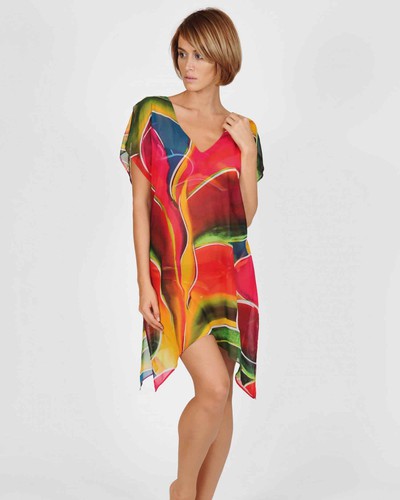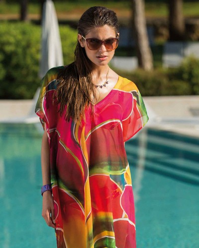 A kaftan made from a fine, thin micro-polyester knit fabric with decorative piping detail on the low cut back. It will charm you with: