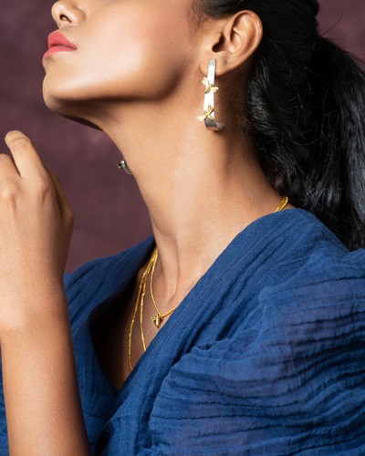 The earrings are long danglers with small bug motifs on the top to give it a quirky effect. The Danglers are gold whereas the bugs are of a contrasting silver polish. This can be customised vice versa for the customer